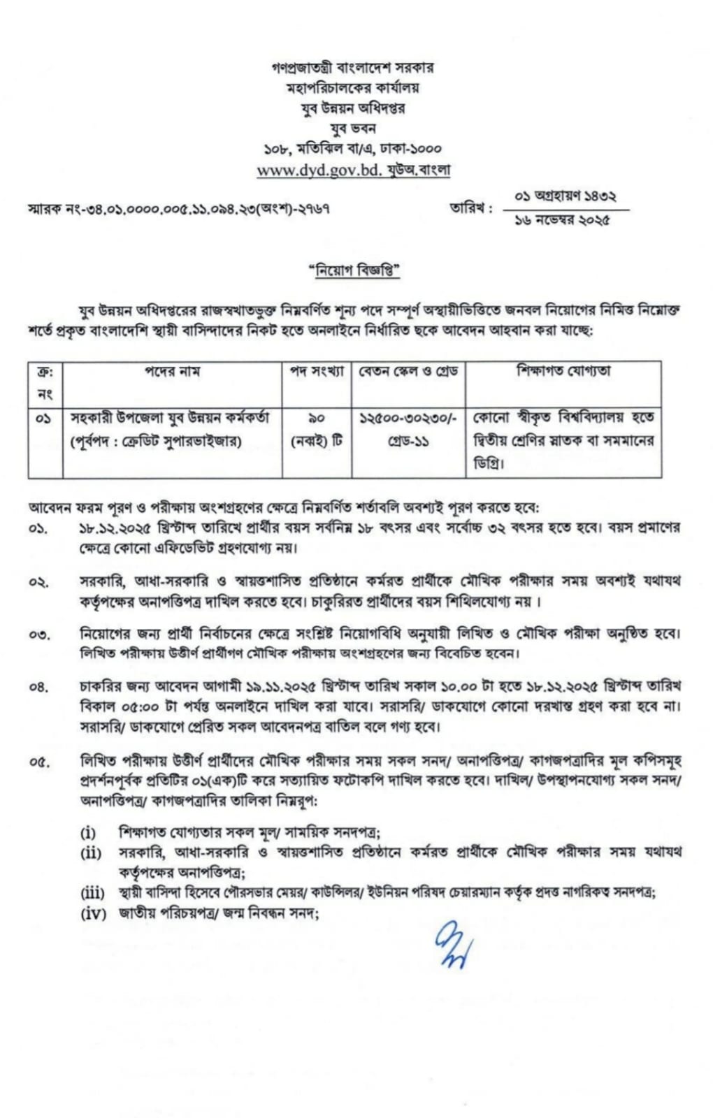 নিয়োগ বিজ্ঞপ্তিঃ যুব উন্নয়ন অধিদপ্তরের রাজস্বখাতভূক্ত শূন্য পদে সম্পূর্ণ অস্থায়ীভিত্তিতে জনবল নিয়োগ বিজ্ঞপ্তি