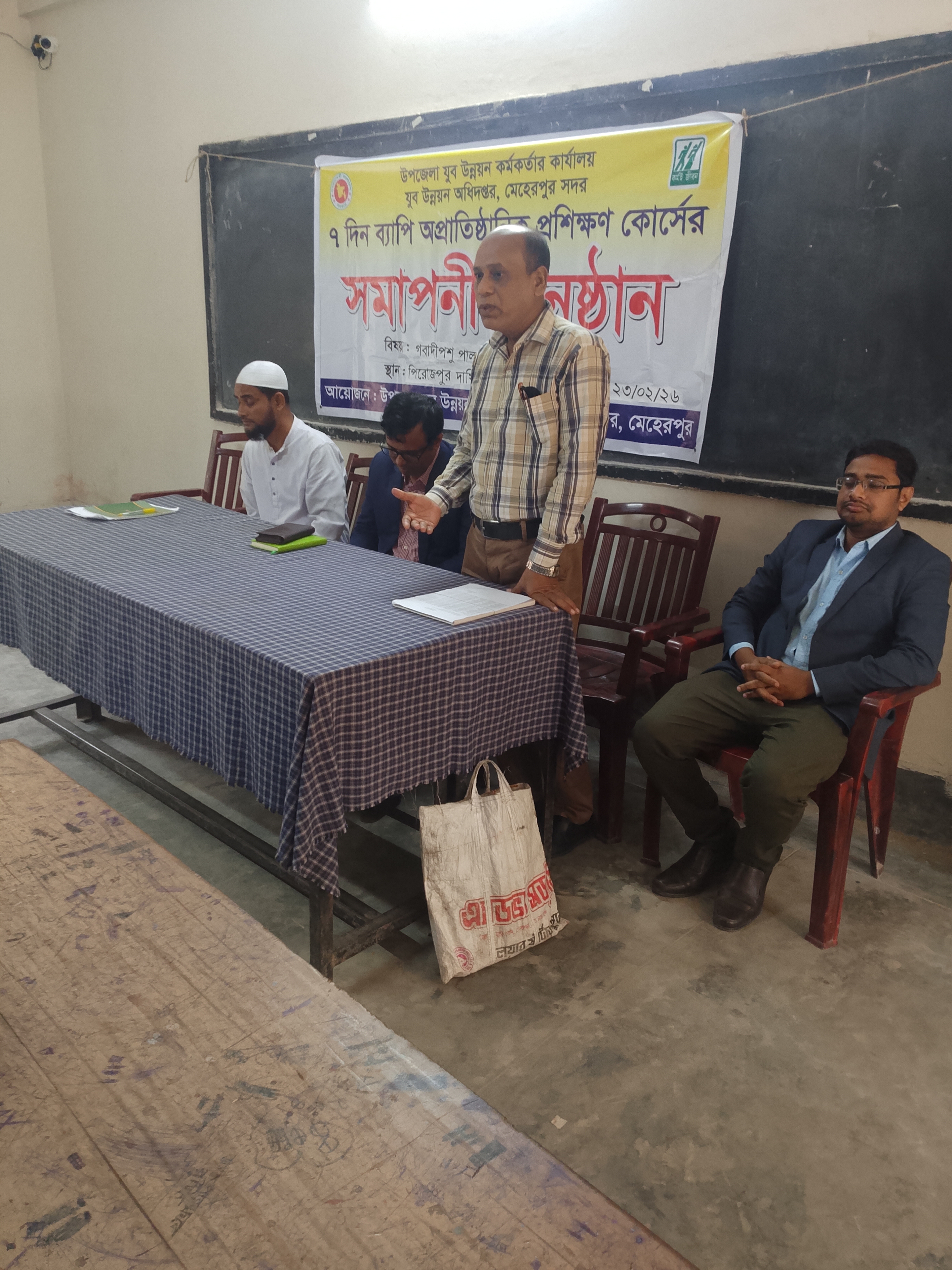 যুব উন্নয়ন অধিদপ্তর, মেহেরপুর সদর, মেহেরপুর কর্তৃক আয়োজিত ৭ দিন ব্যাপী গবাদীপশুপালন বিষয়ক ভ্রাম্যমান প্রশিক্ষণ কোর্সের সমাপনী অনুষ্ঠান মেহেরপুর সদর উপজেলার পিরোজপুর দাখিল মাদ্রাসায় এবং পৌর এলাকার শিশুবাগান পাড়ায় অনুষ্ঠিত হয়। অনুষ্ঠানে প্রধান অতিথী হিসেবে উপস্থিত ছিলেন উপজেলা নির্বাহী অফিসার জনাব খায়রুল ইসলাম, বিশেষ অতিথী হিসেবে উপস্থিত ছিলেন জনাব মোহাঃ আব্দুল্লাহ আল মামুন, উপজেলা যুব উন্নয়ন অফিসার এবং কোর্স কো অর্ডিনেটর ও সহকারী উপজেলা যুব উন্নয়ন কর্মকর্তা জনাব মোঃ মাহফুজুর রহমান। অনুষ্ঠানে প্রশিক্ষানার্থীদের মধ্যে ভাতা ও সার্টিফিকেট তুলে দেয়া হয়।