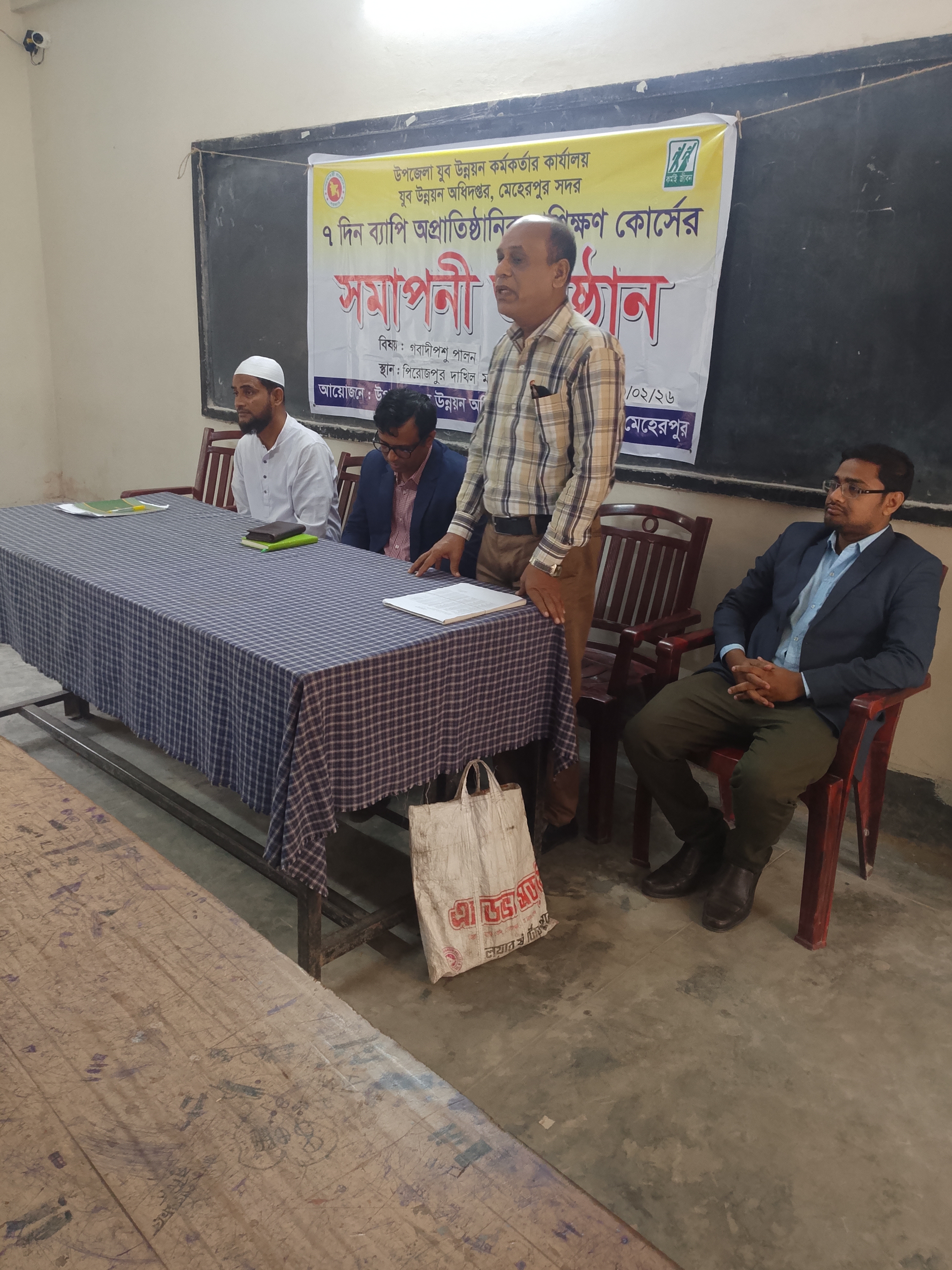 যুব উন্নয়ন অধিদপ্তর, মেহেরপুর সদর, মেহেরপুর কর্তৃক আয়োজিত ৭ দিন ব্যাপী গবাদীপশুপালন বিষয়ক ভ্রাম্যমান প্রশিক্ষণ কোর্সের সমাপনী অনুষ্ঠান মেহেরপুর সদর উপজেলার পিরোজপুর দাখিল মাদ্রাসায় এবং পৌর এলাকার শিশুবাগান পাড়ায় অনুষ্ঠিত হয়। অনুষ্ঠানে প্রধান অতিথী হিসেবে উপস্থিত ছিলেন উপজেলা নির্বাহী অফিসার জনাব খায়রুল ইসলাম, বিশেষ অতিথী হিসেবে উপস্থিত ছিলেন জনাব মোহাঃ আব্দুল্লাহ আল মামুন, উপজেলা যুব উন্নয়ন অফিসার এবং কোর্স কো অর্ডিনেটর ও সহকারী উপজেলা যুব উন্নয়ন কর্মকর্তা জনাব মোঃ মাহফুজুর রহমান। অনুষ্ঠানে প্রশিক্ষানার্থীদের মধ্যে ভাতা ও সার্টিফিকেট তুলে দেয়া হয়।